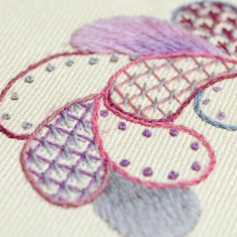 Long and Short as ‘soft shading’, Crewel Stem, French Knots, and Laid and Couched Work in three variations.
