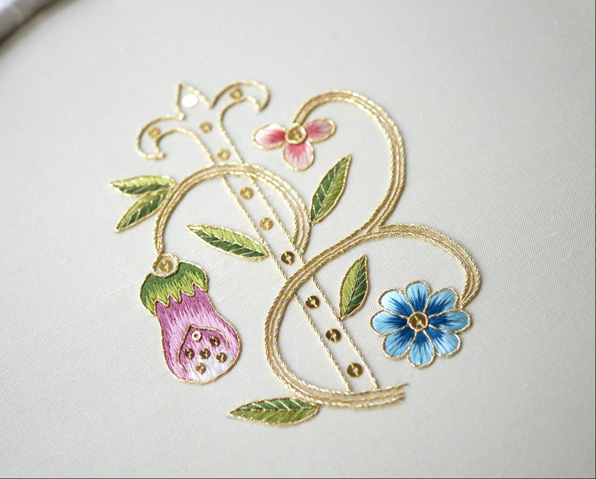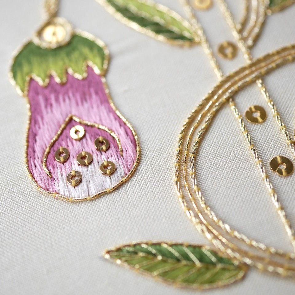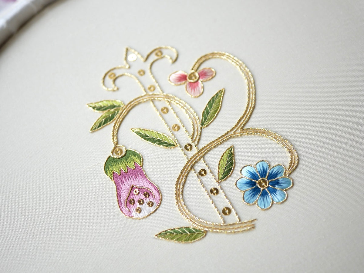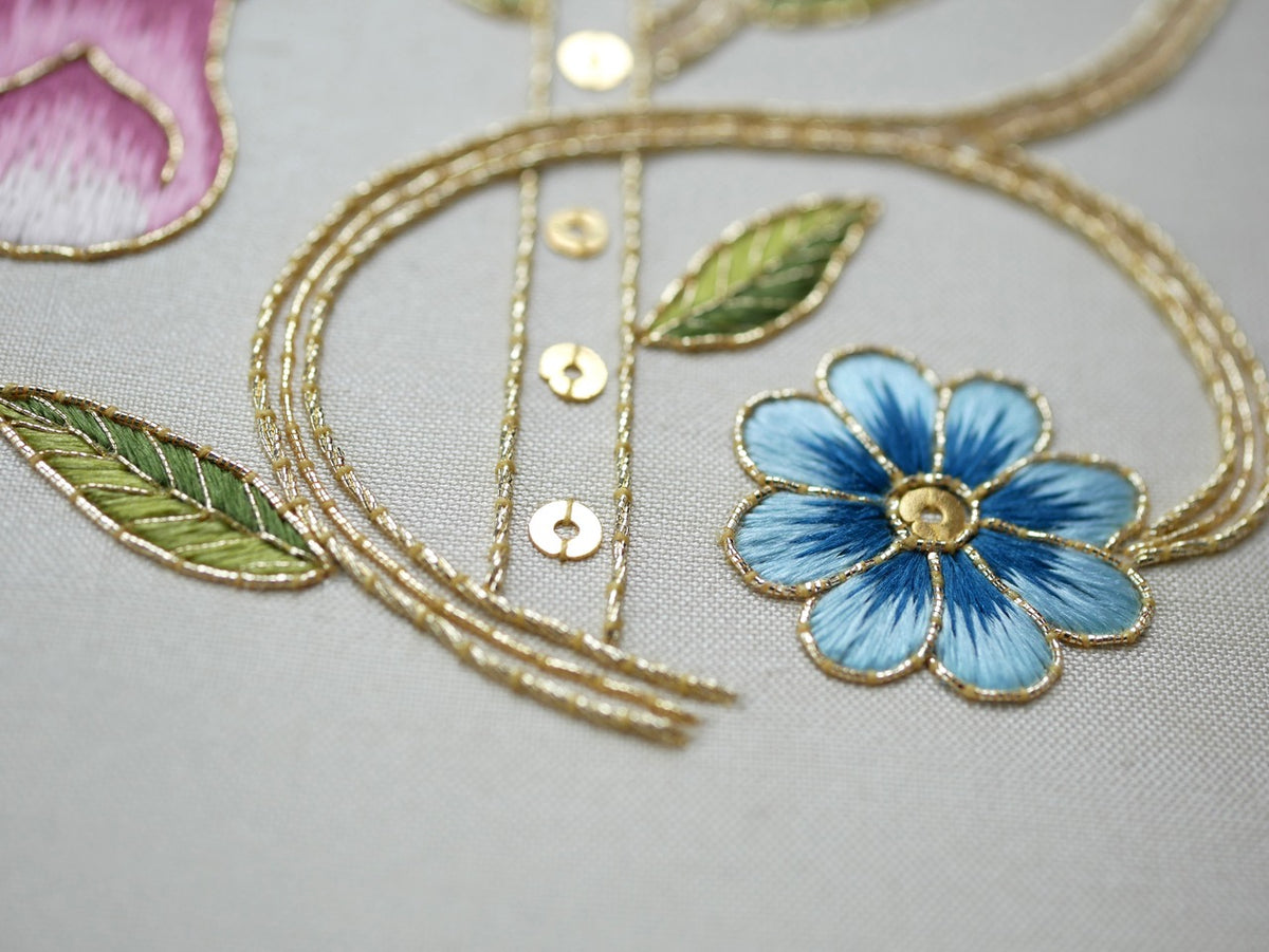 The kit combines silk shading with goldwork techniques to create a piece rich in texture and dimension. Stitches include Fly Stitch, Satin Stitch, Long & Short shading, Gold Couching, and the application of spangles — offering a rewarding exploration of silk and metal thread embroidery.