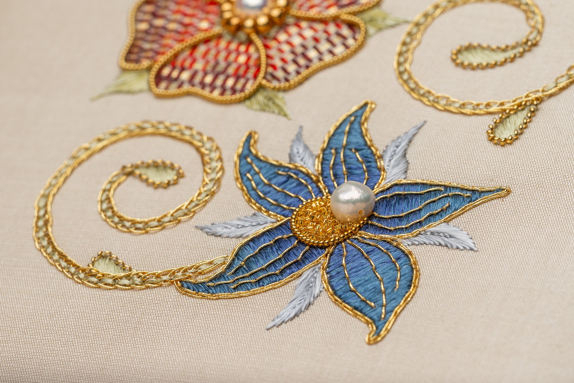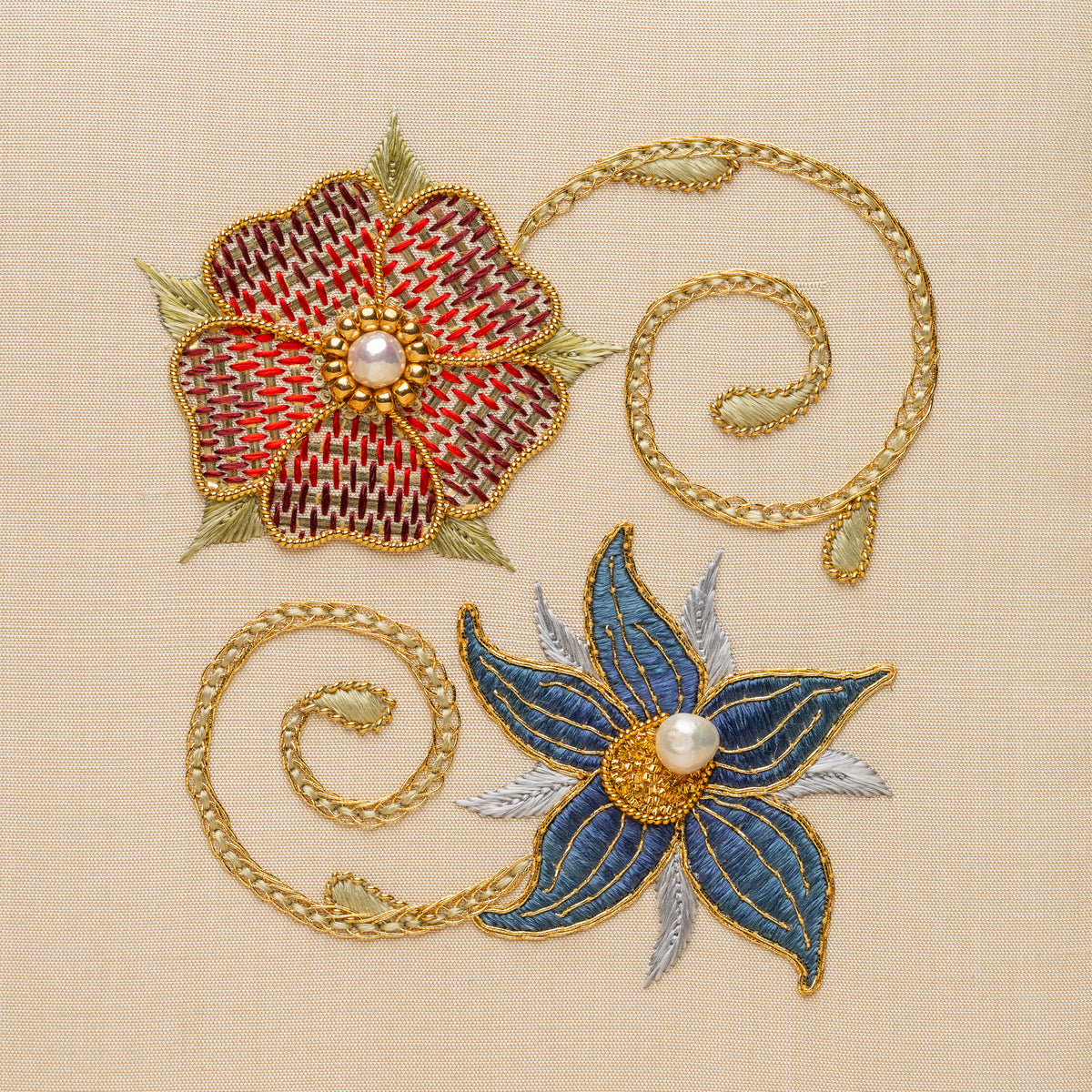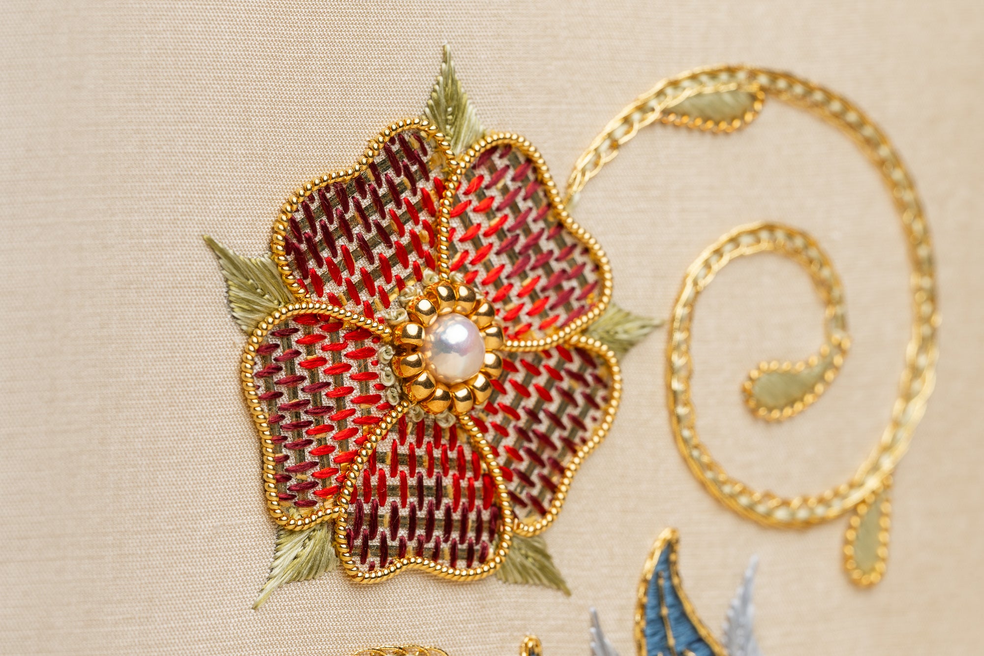 Techniques: Applying Gilt Plate, Pearl Purl, pearls and beads, and Passing Thread.
