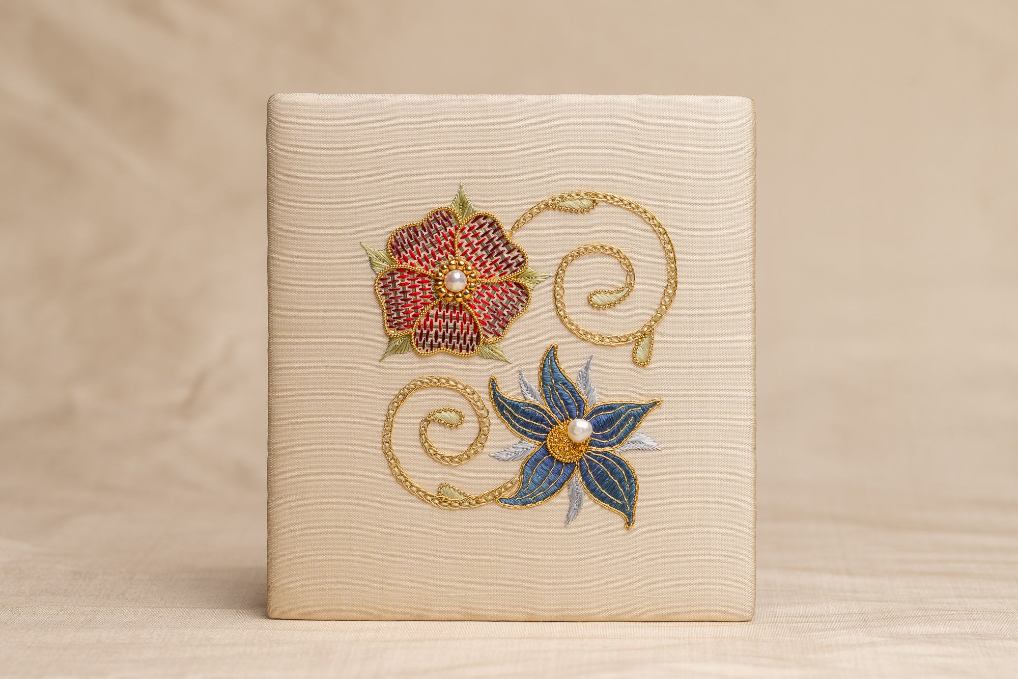 Stitches:Padded Satin, Closed Fly, Laid Work, Back Stitch, Burden Stitch, Couching, French Knots.