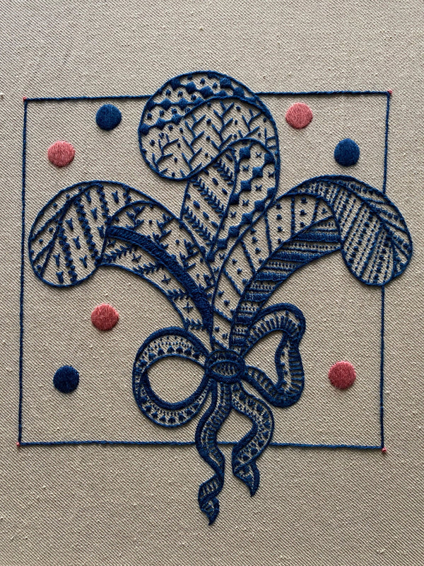 Buttonhole, Coral, Crewel Stem, Detached Chain, Ermine, Feather, Fern, French Knots, Leaf, Long Armed Cross, Pistil, Raised Satin, Running, Satin, Seeding, Sword Stitch and Tête de Boeuf