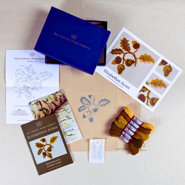 Celebrate the English Oak Tree with the Elizabethan Acorn Kit. Replicated from a set of bed hangings at Hardwick Hall in Derbyshire, this design showcases a roundel of acorns and oak leaves in a medley of interesting Crewel techniques.