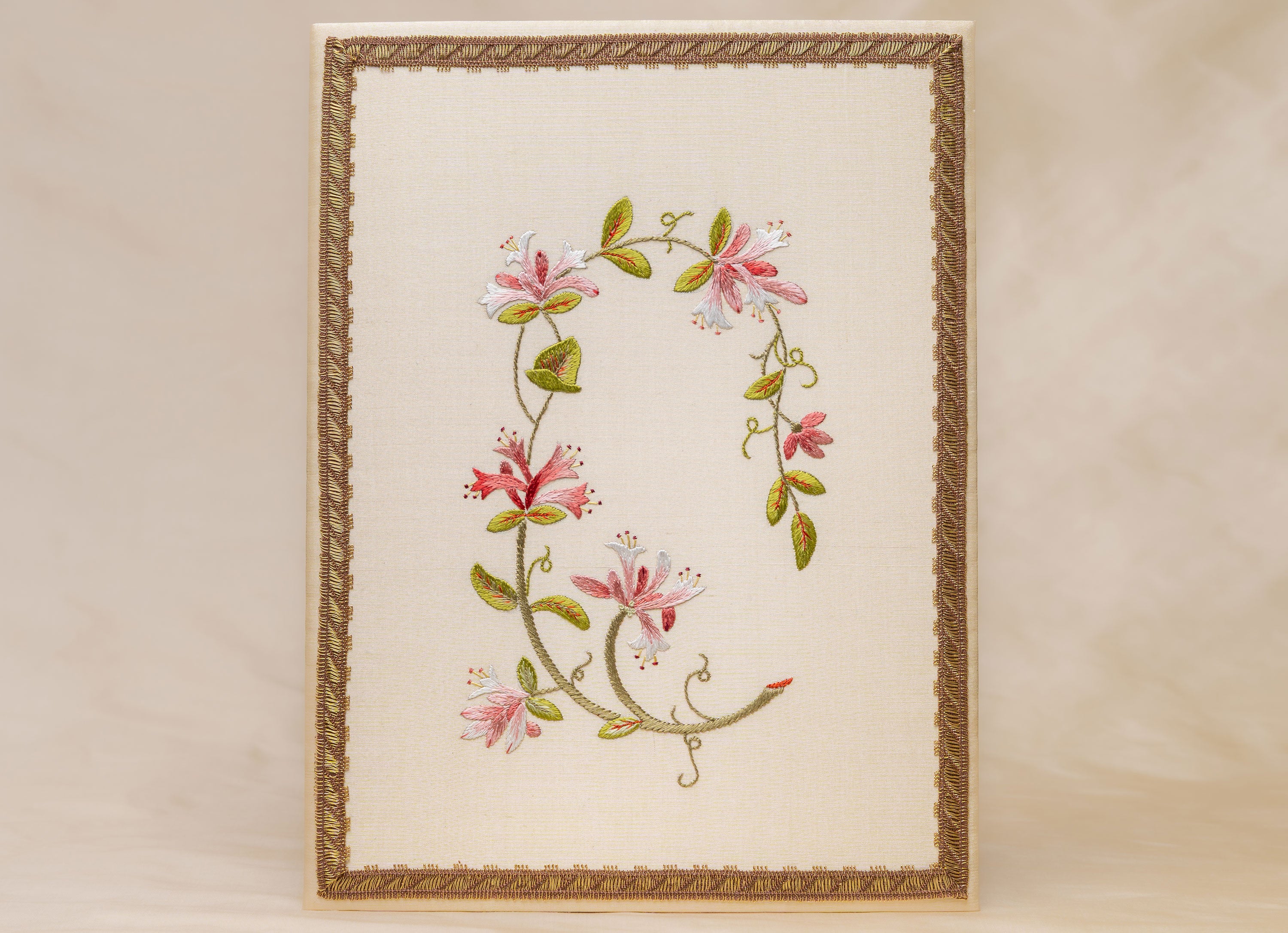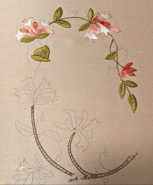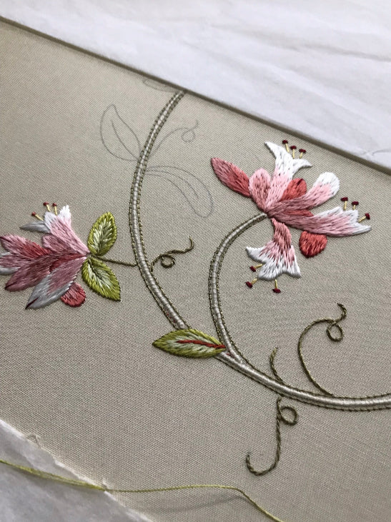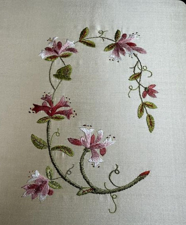 The curving motif depicts a beautiful Honeysuckle branch in an arched shape. Completed in twisted DeVere silks on a pure silk fabric, this delicate design can be finished as a framed piece, set into a box lid, or completed as a book cover.