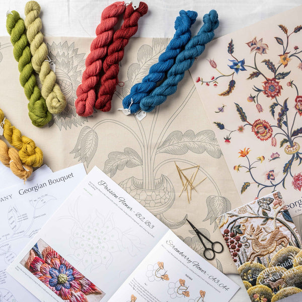 • Stitch a Georgian Classic: Stitch a richly detailed floral arrangement inspired by early 20th-century interpretations of Georgian-era embroidery
