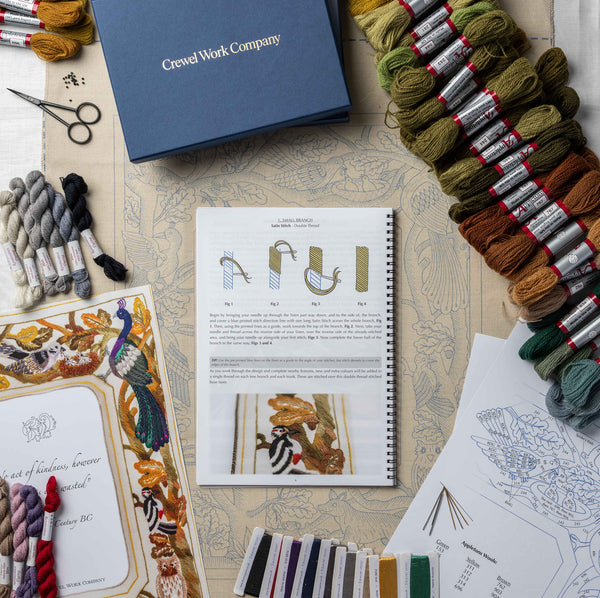 As you work your way around the mirror, you will build your core crewel skills, perfecting your practice by the time you reach the final most advanced animal, the Peacock.