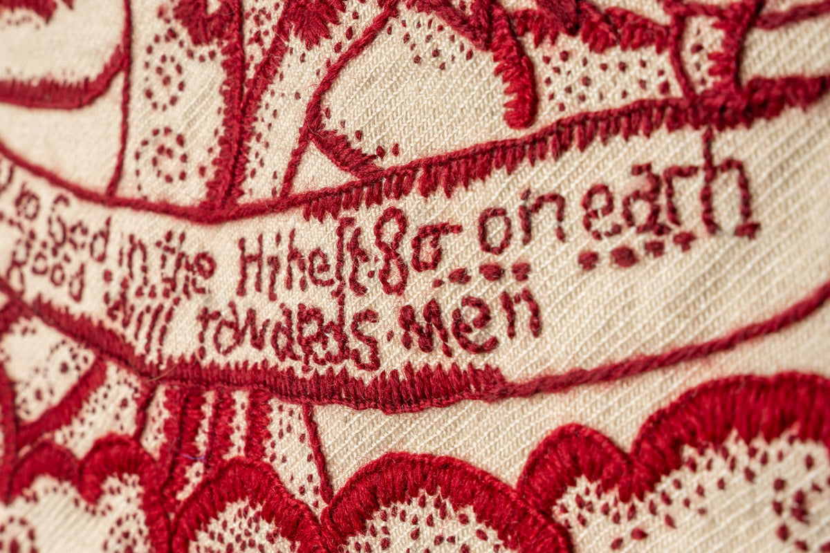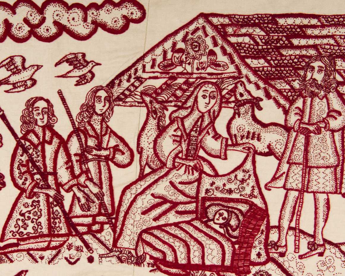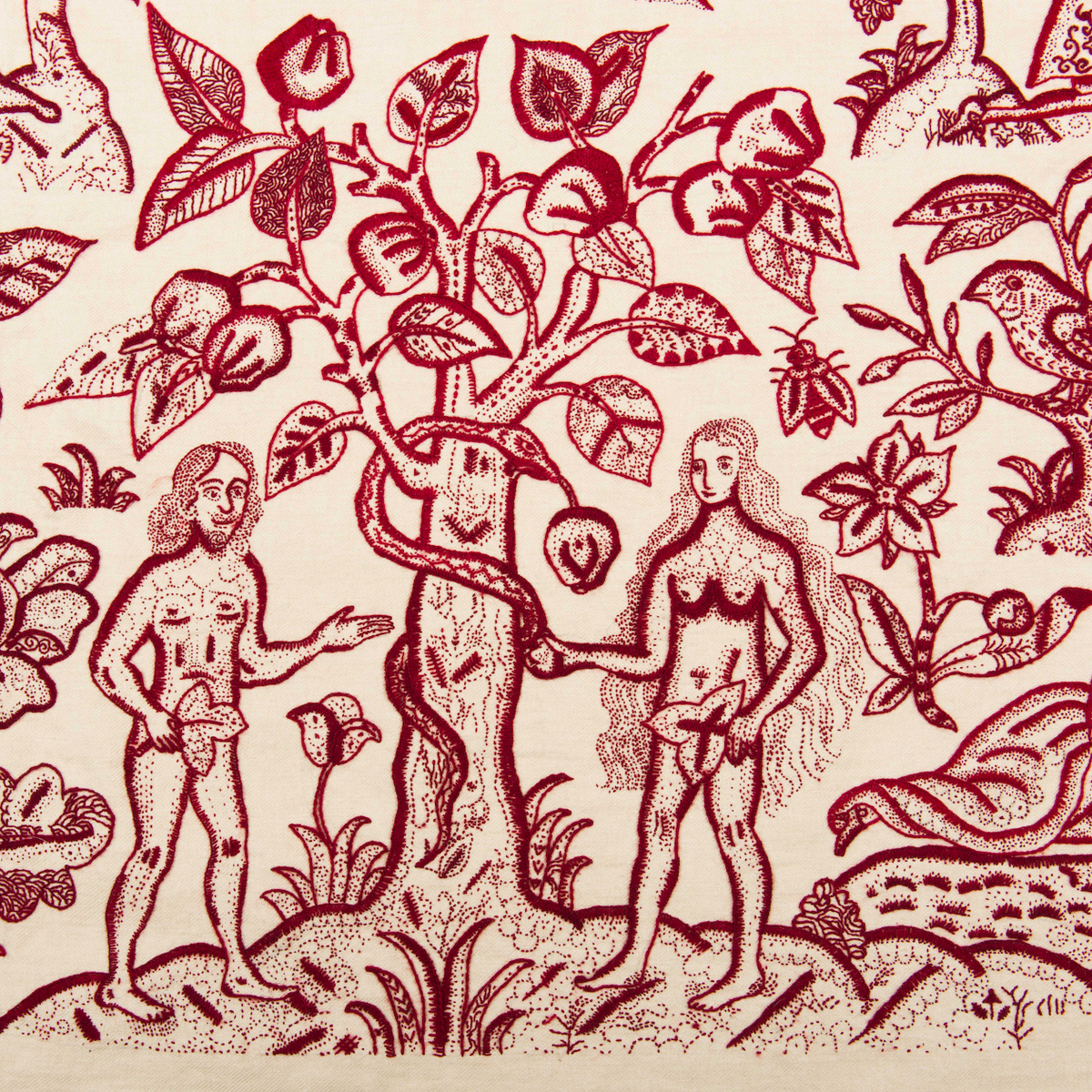 This glorious embroidery replicates a mid-17th century Altar Frontal which is currently in the Embroiderers' Guild National needlework collection held at Bucks Museum. The design depicts a collection of first-testament biblical scenes including the birth of Jesus, the Nativity Scene, and Adam & Even in the Garden of Eden.
