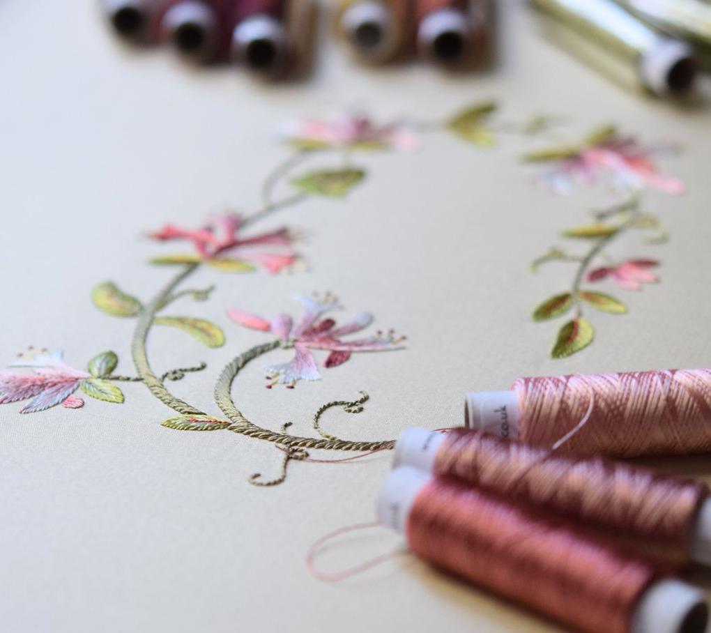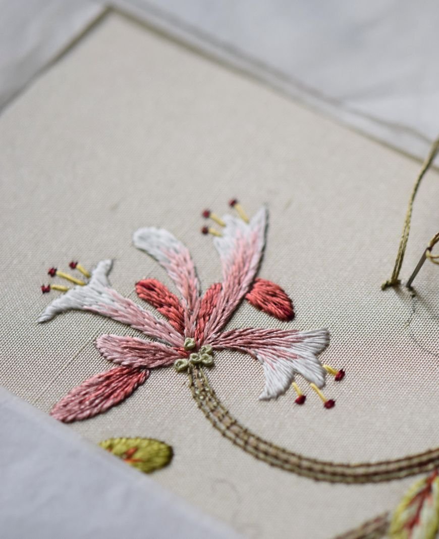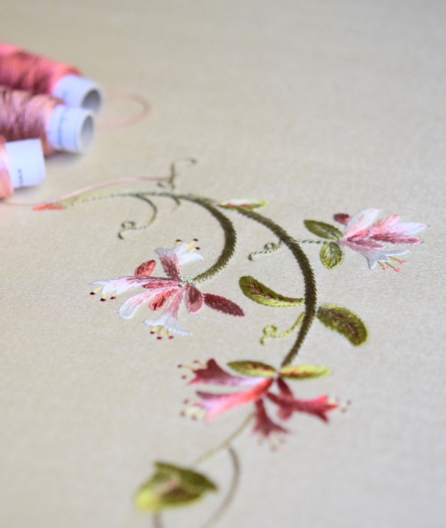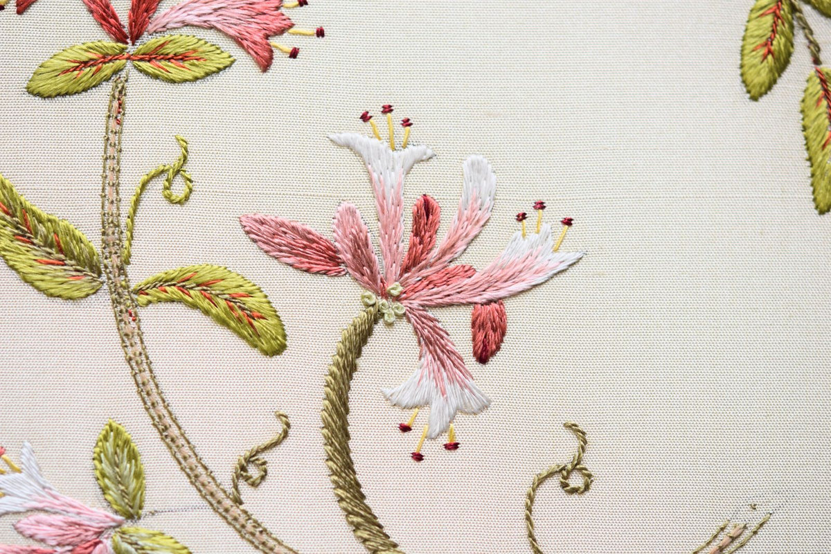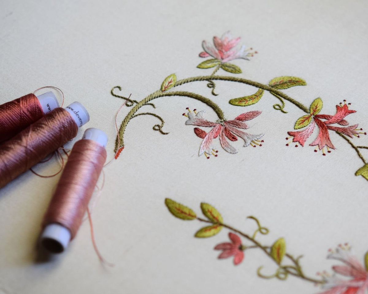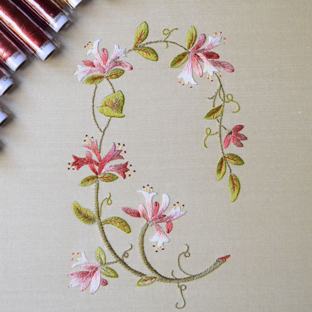 Featuring honeysuckle in pink and cream hues set in a curing branch of delicate green leaves, Natalie’s recreation brings Nina’s design to life and showcases the versatility of twisted silk threads in a variety of beautiful pink and green hues.