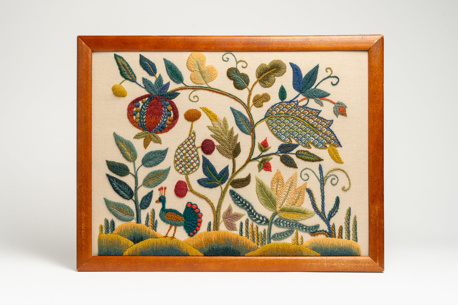 Our latest crewel work collaboration with Gawthorpe Hall and the Rachel Kay Shuttleworth Textile Collection. Enjoy this rich, Jacobean floral design featuring Pomegranates, acanthus leaves and Rachel's favourite - a vibrant blue Peacock.