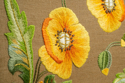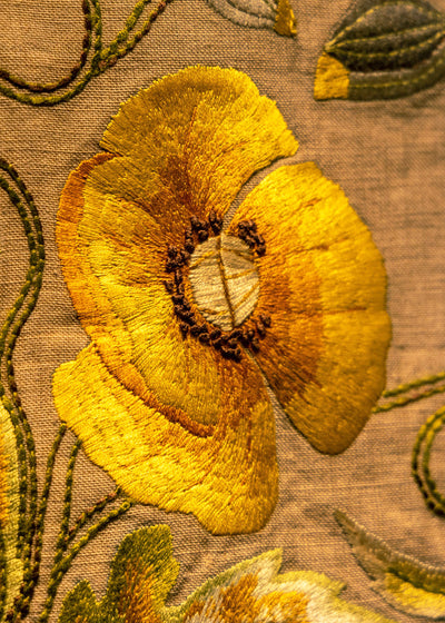 This fabulous, vibrant design has been recreated by Deborah based on a larger early-20th Century Arts & Crafts embroidery, which until recently was on display in the Gawthorpe Hall Textile Galleries. The original textile, has a complex repeating pattern bordering a large piece of fabric, with open flowers, buds, stems and leaves.