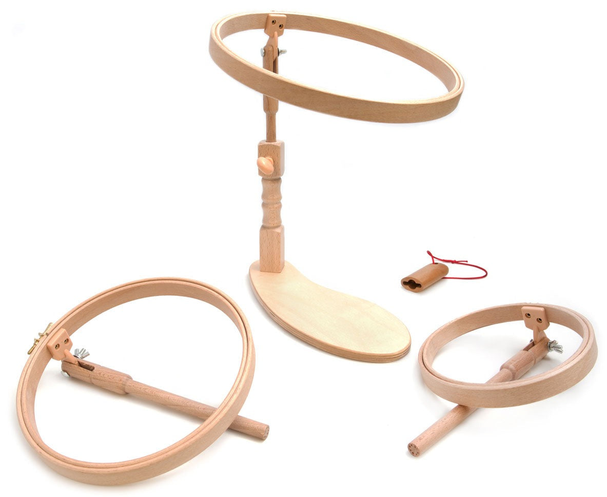 Stitch anywhere in the house or garden. Using your thigh to hold the base paddle secure, this hands-free frame has been developed over many years in association with the maker and offers an adjustable angle and height for maximum comfort while you stitch.