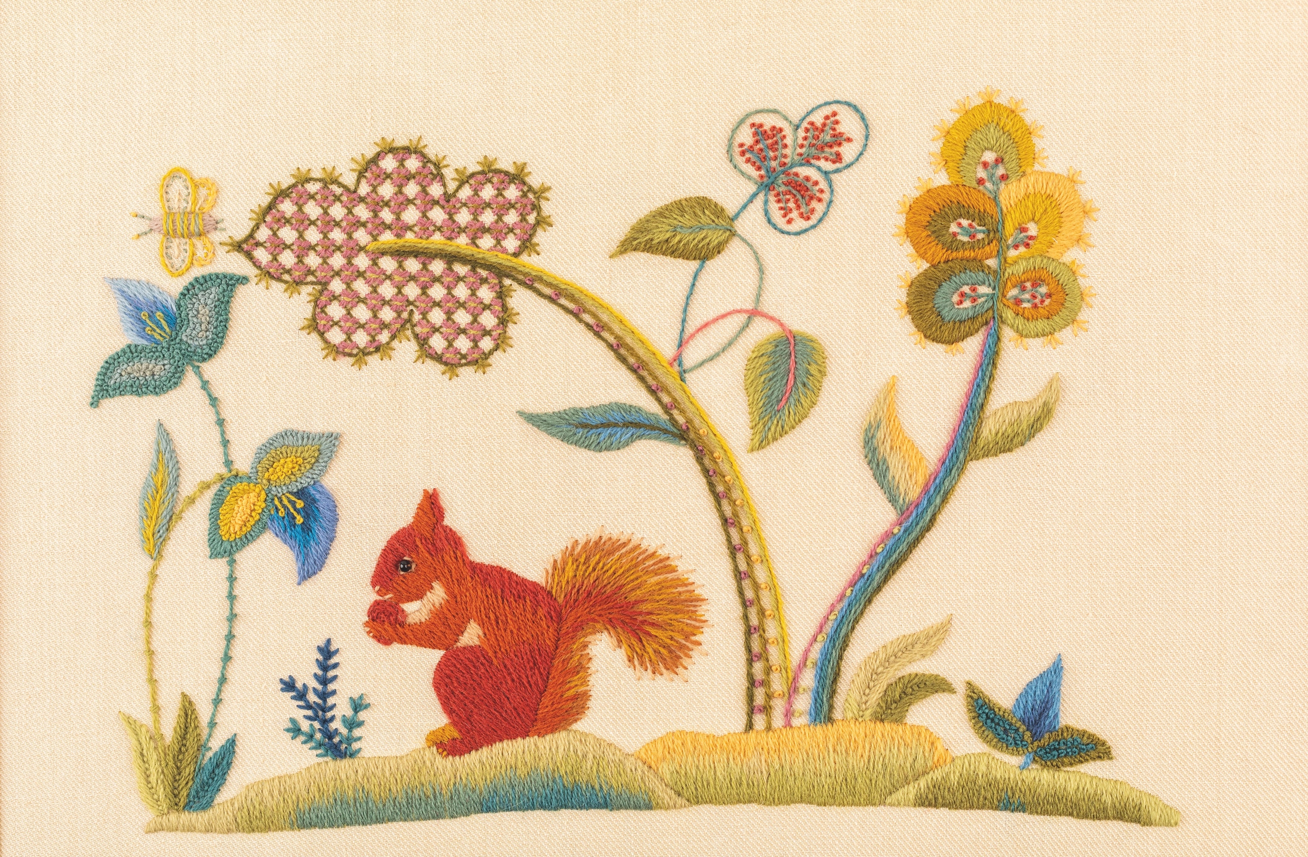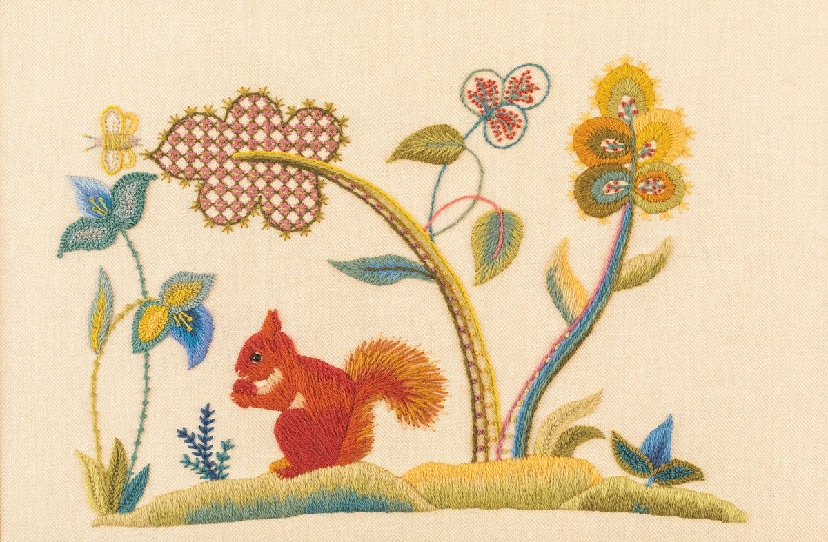 Bring the charming Greedy Squirrel to life with this complete materials kit. Inspired by early 20th-century English crewelwork, this design captures a red squirrel nibbling in its woodland home.