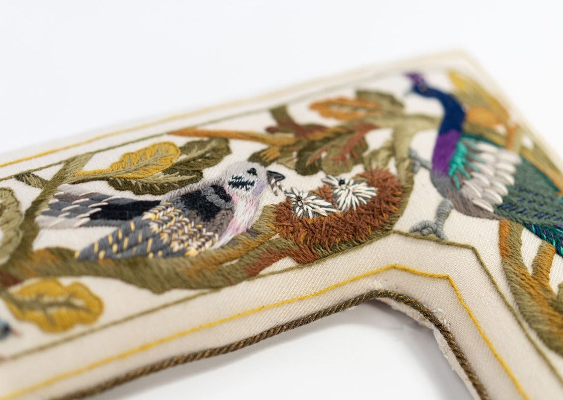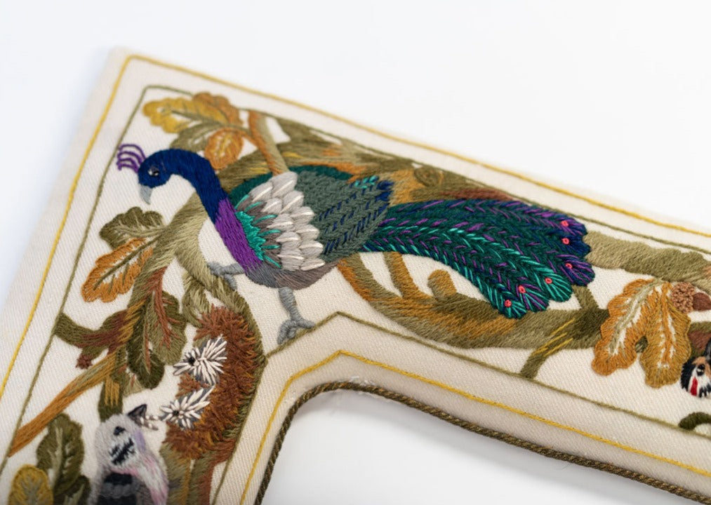 As you work your way around the mirror, you will build your core crewel skills, perfecting your practice by the time you reach the final most advanced animal, the Peacock.