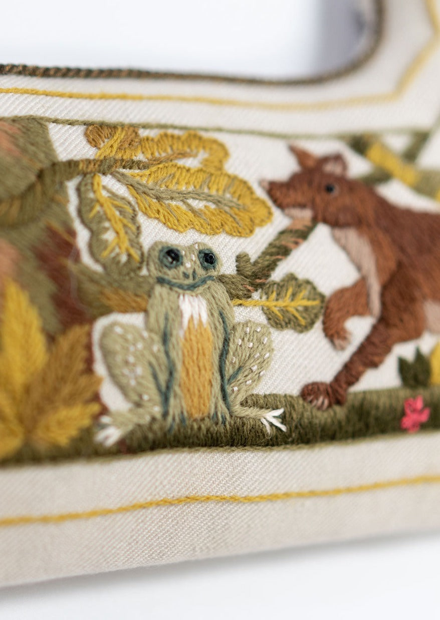 Reflect timeless tales with the Aesop's Mirror Frame Kit. This design features motifs inspired by Aesop's fables, offering a narrative-rich project. Ideal for creating a meaningful and decorative piece that tells a story through embroidery.