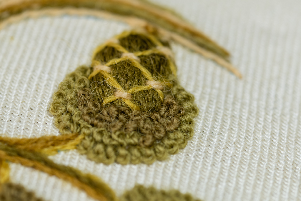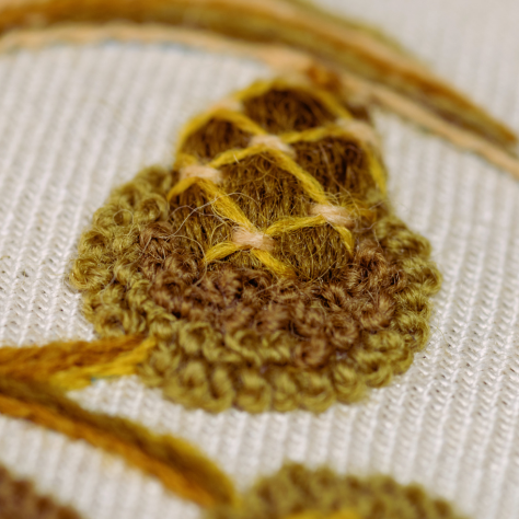 Raised Satin, Laid & Couched Work, Long & Short as ‘soft shading’, Crewel Stem, French Knots