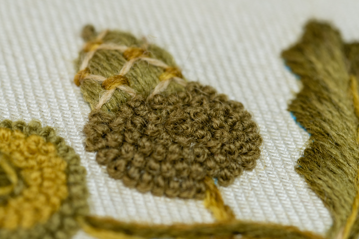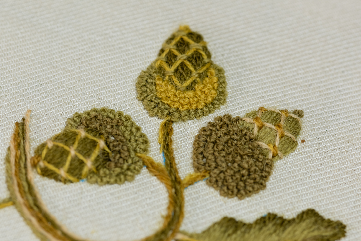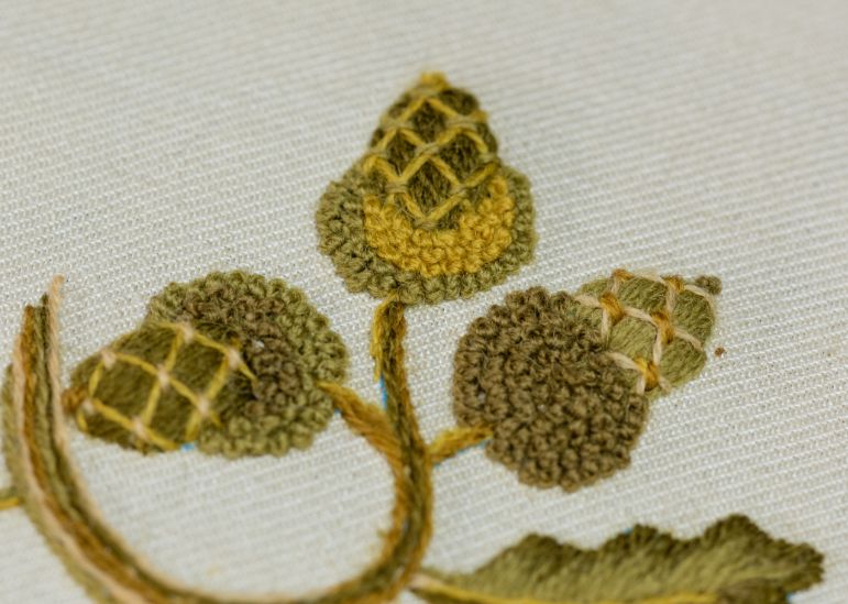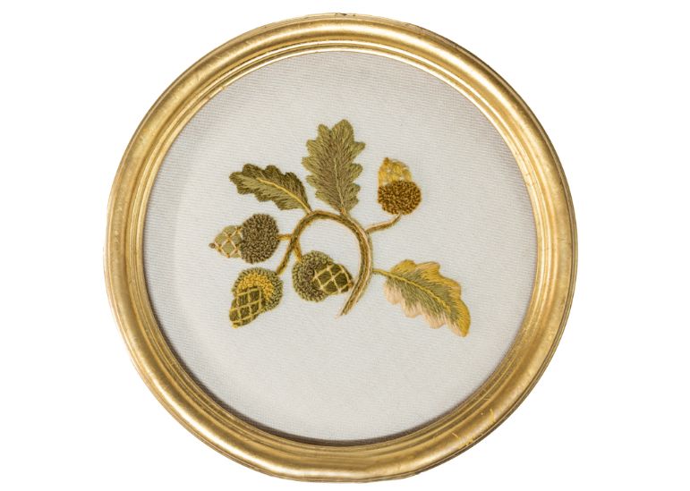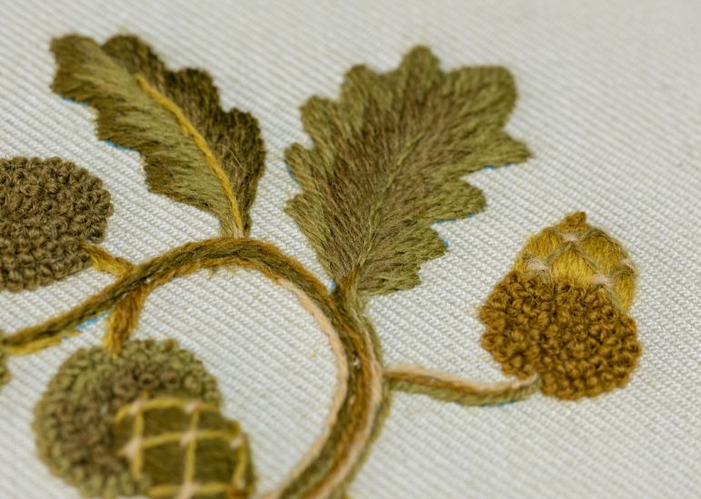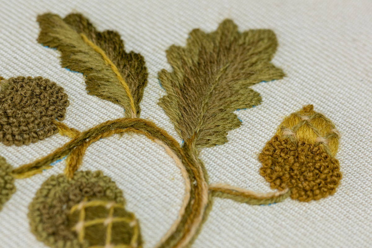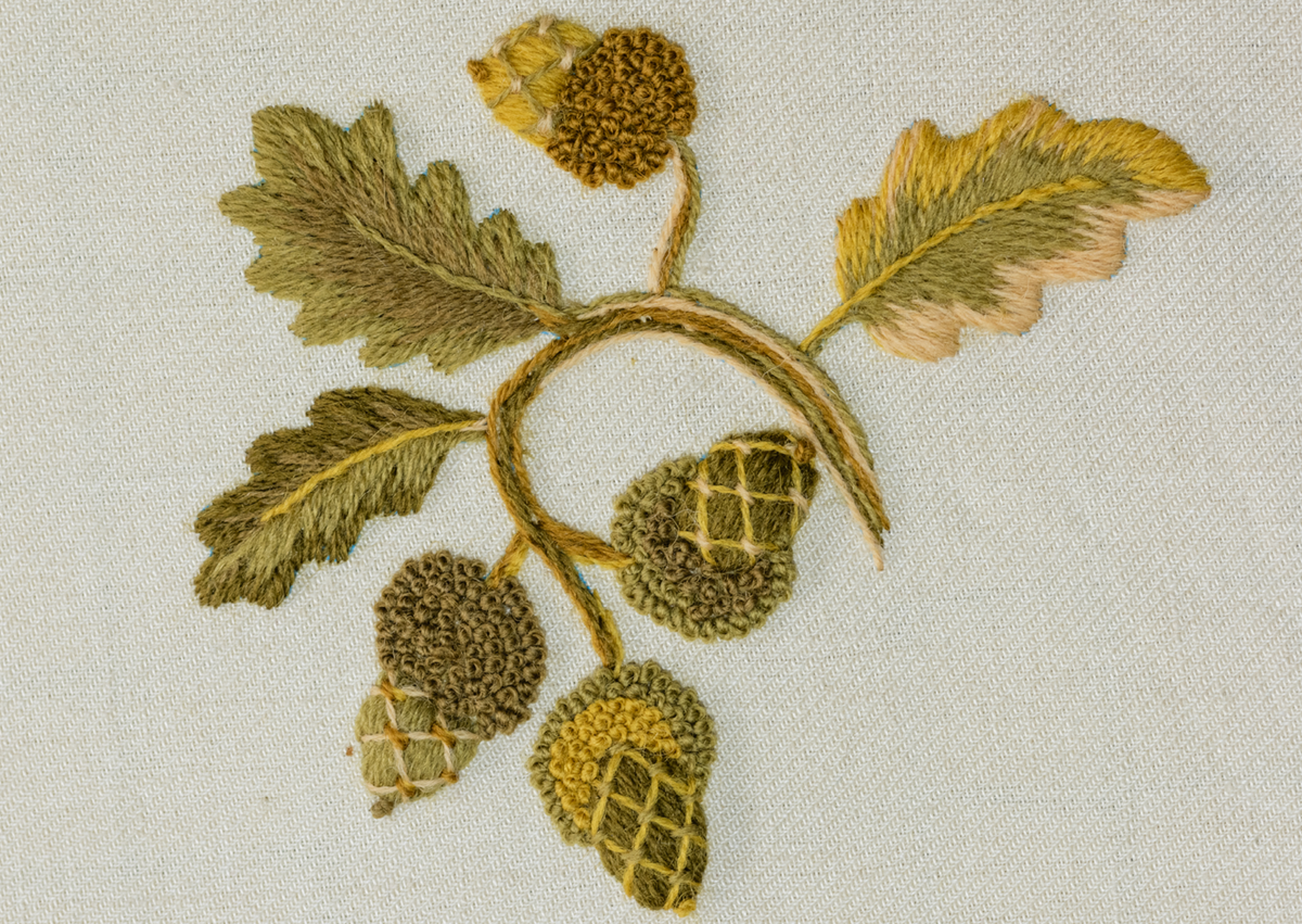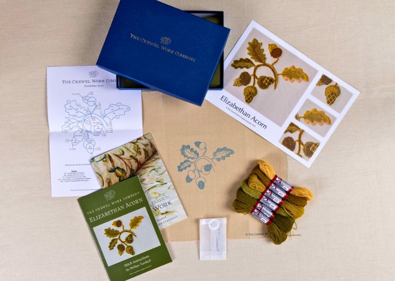 Celebrate the English Oak Tree with the Elizabethan Acorn Kit. Replicated from a set of bed hangings at Hardwick Hall in Derbyshire, this design showcases a roundel of acorns and oak leaves in a medley of interesting Crewel techniques.