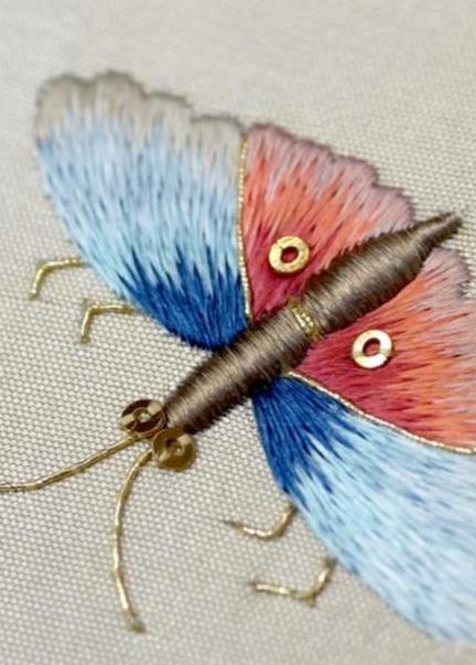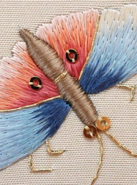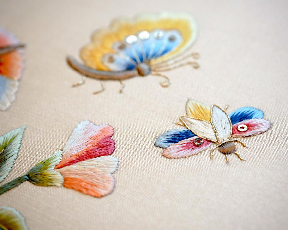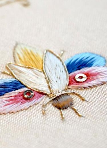 Two butterflies and a third winged friend flutter around a small flower in this charming arrangement with clever use of silk and gold highlights, and subtle placement of spangles. This sweet design is the perfect introduction to the Feller Mirror collection - bringing together the elegance and simplicity of the original, in a fun and approachable 2-day class.