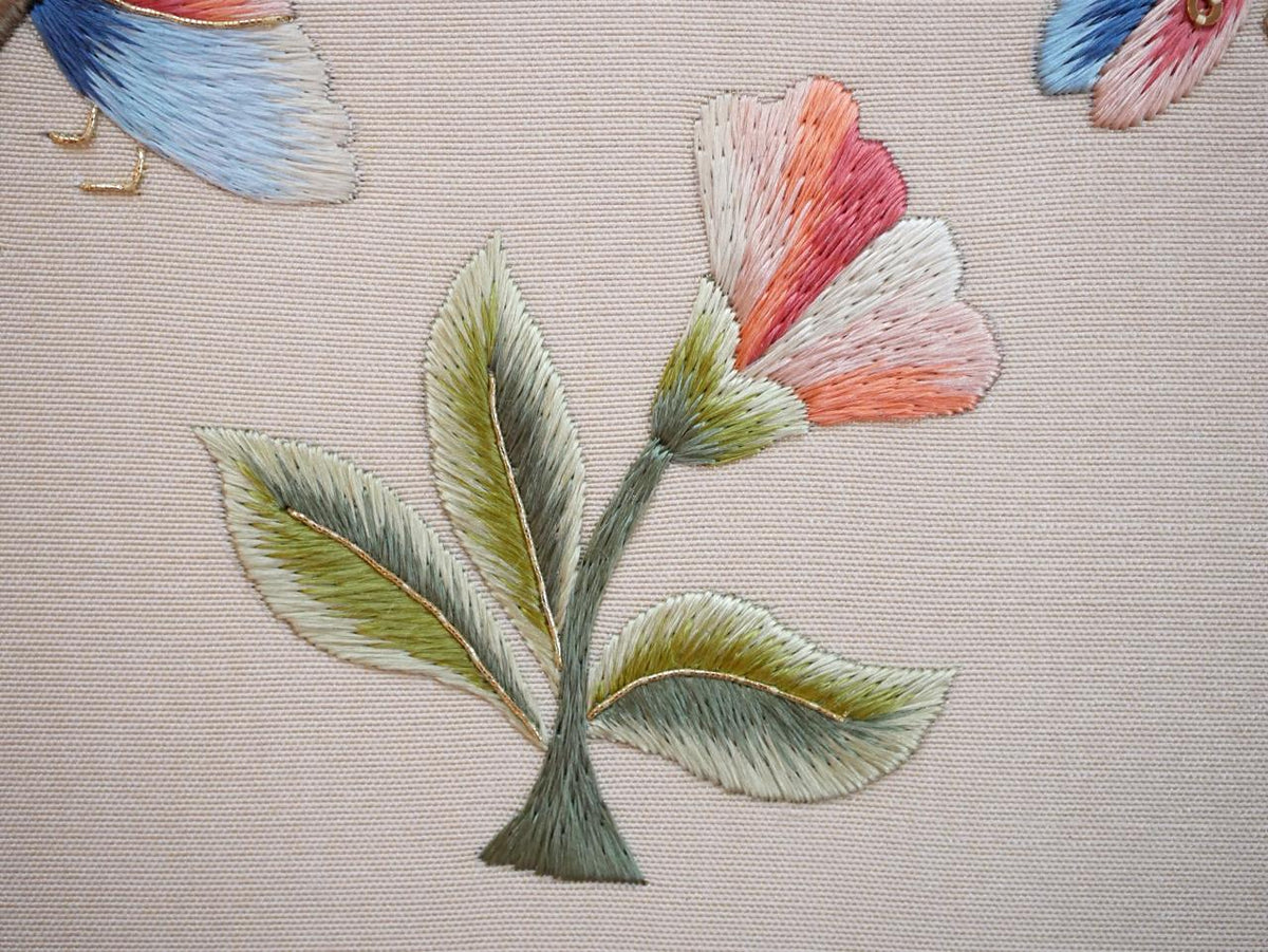 This sweet design offers those who have been admiring the work of our Feller Mirror course students the chance to be part of the same wonderful journey. Stitch three insects from the mirror fluttering around a mallow flower in a range of beautiful DeVere silk threads using long and short stitch, finished with a touch of gold and tiny spangles.