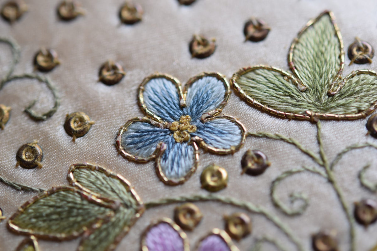 Discover the beauty of silk shading and goldwork in this one-day beginner class with acclaimed embroiderer Natalie Dupuis. You will create a delicate Forget Me Not in an option of three colours of DeVere silks, inspired by Natalie’s Book of Days design - a project specially chosen for its elegance and approachability for newcomers to silk embroidery.