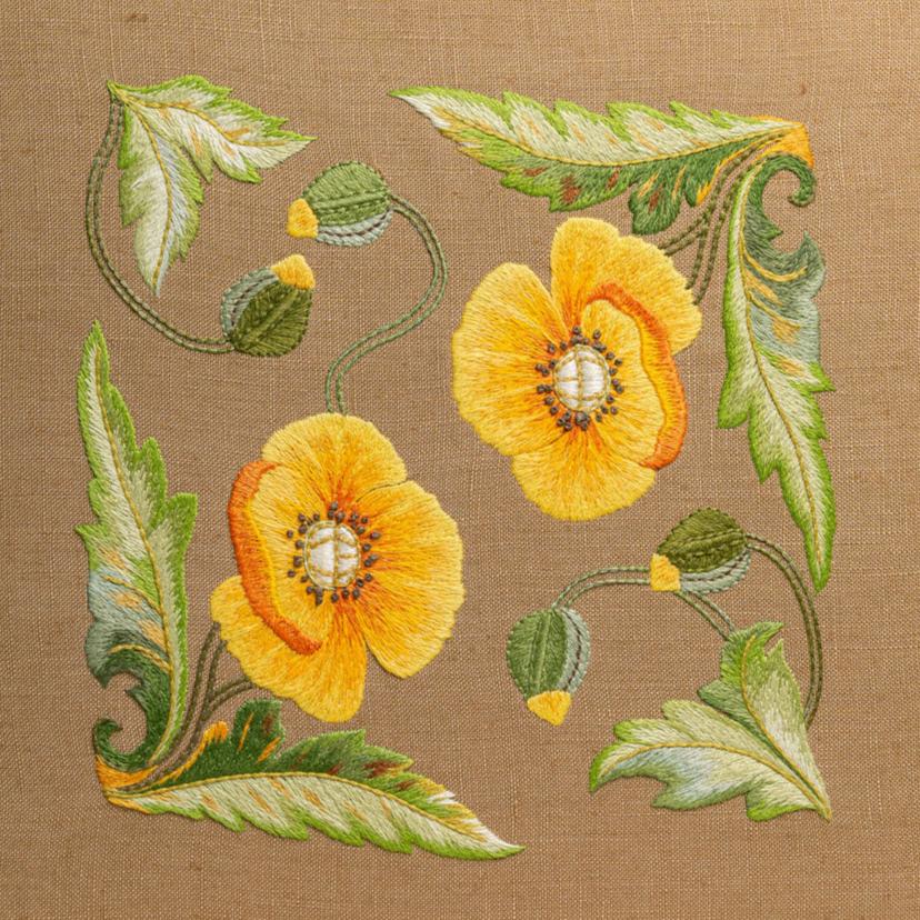 The original embroidery, which is a large item perhaps used as a hanging or table cloth, has been cleverly interpreted as a mirrored design by Deborah Wilding, who has recreated the embroidery in DMC stranded cotton, providing students with an accessible way to learn and enjoy silk shading techniques in complex shapes across this painterly design.
