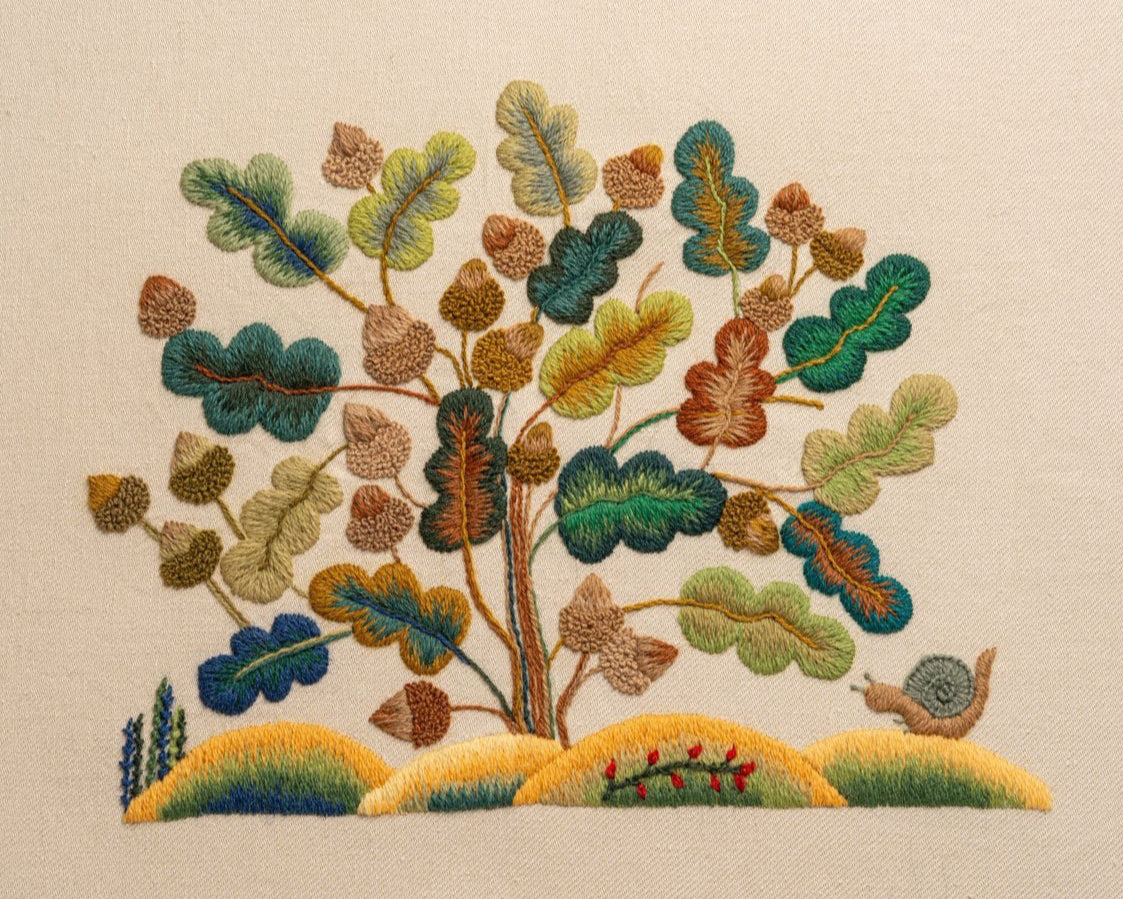 The Gawthorpe Oak Tree & Snail design is an oft-repeated rural scene featured on the pelmets of Rachel Kay Shuttleworth’s famous bed hangings made for her beautiful 16th-century tester bed given to her by her parents on her 21st birthday.