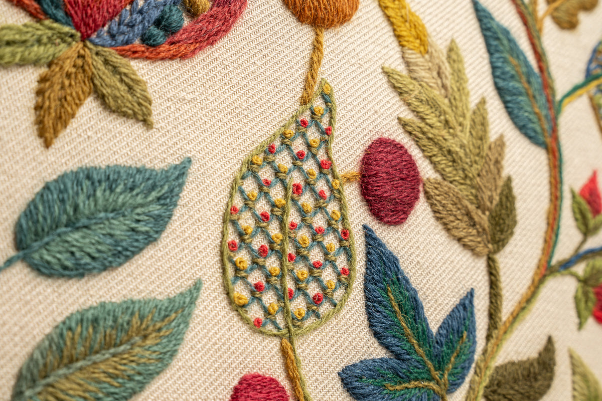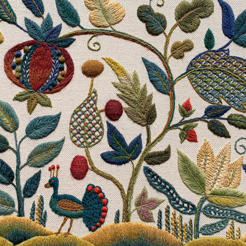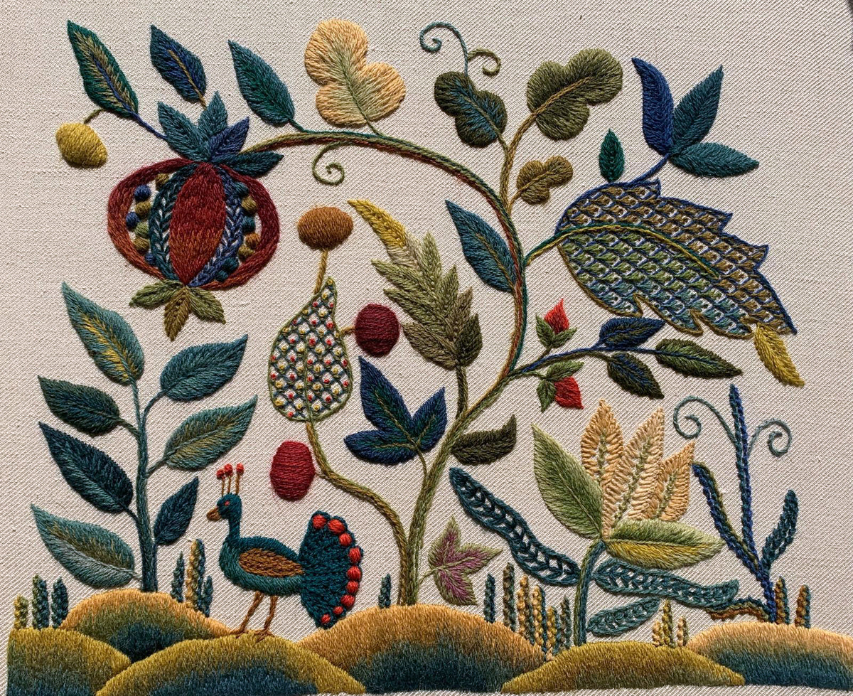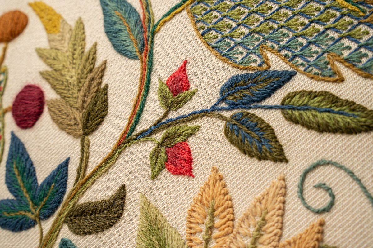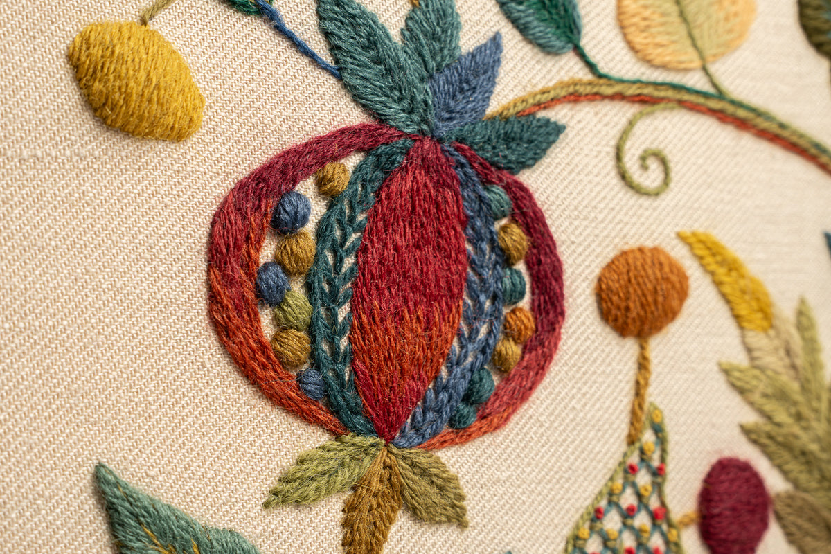 Our latest crewel work collaboration with Gawthorpe Hall and the Rachel Kay Shuttleworth Textile Collection. Enjoy this rich, Jacobean floral design featuring Pomegranates, acanthus leaves and Rachel's favourite - a vibrant blue Peacock.