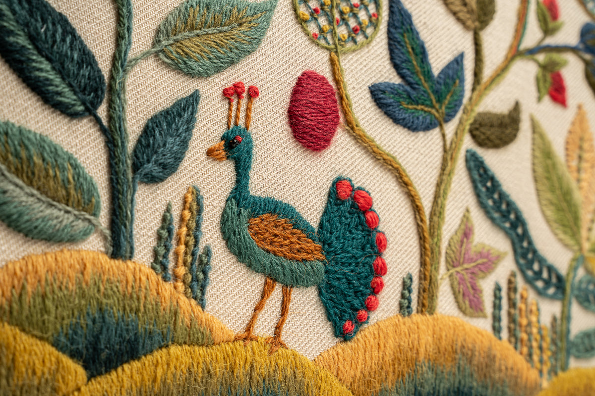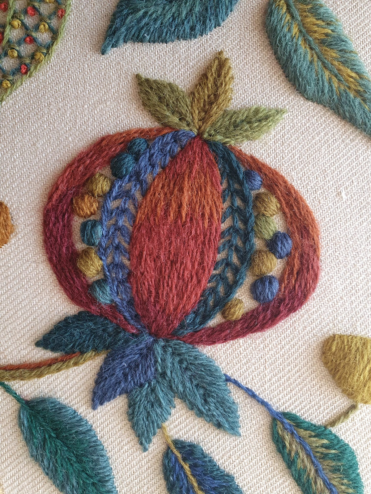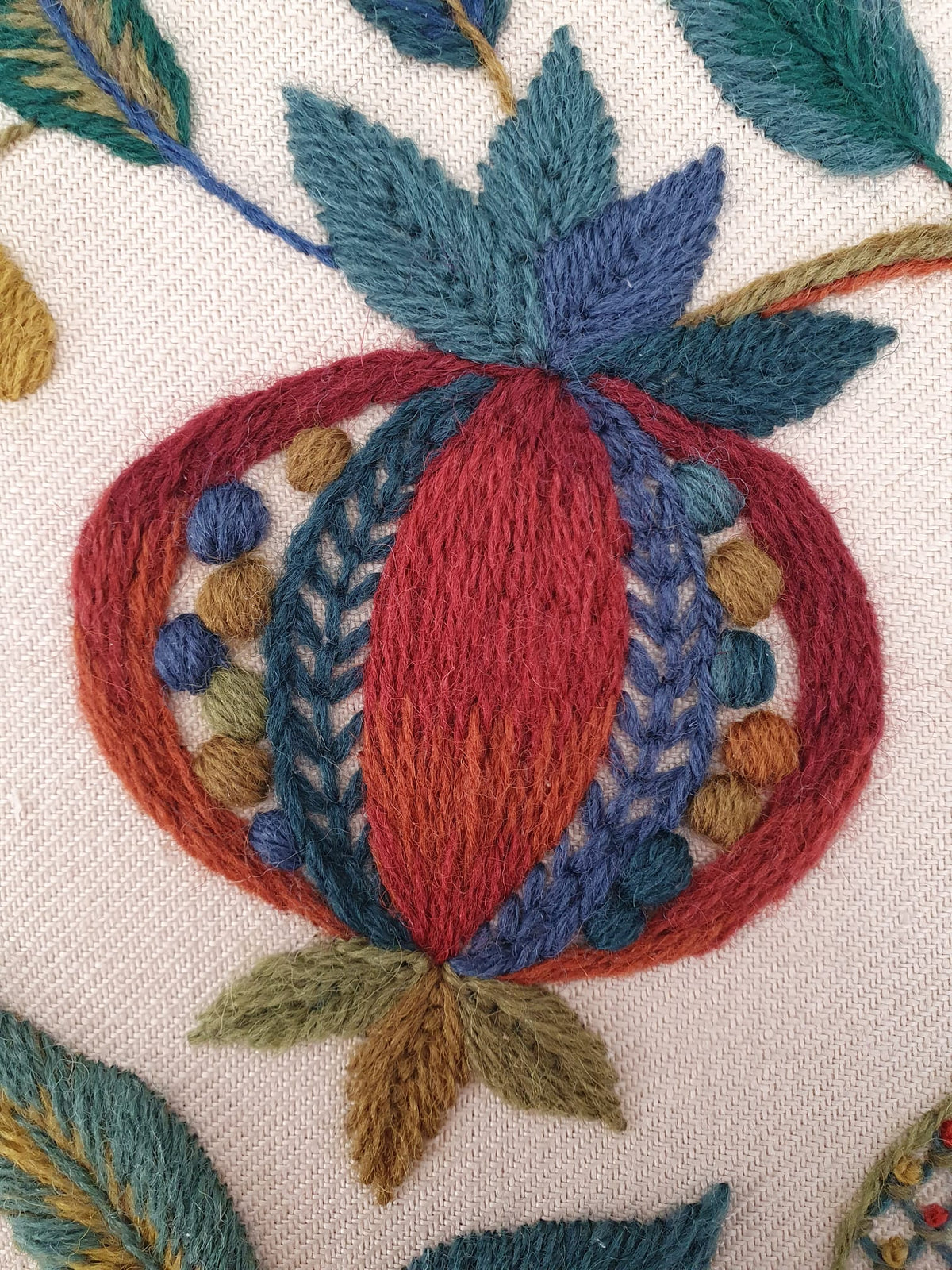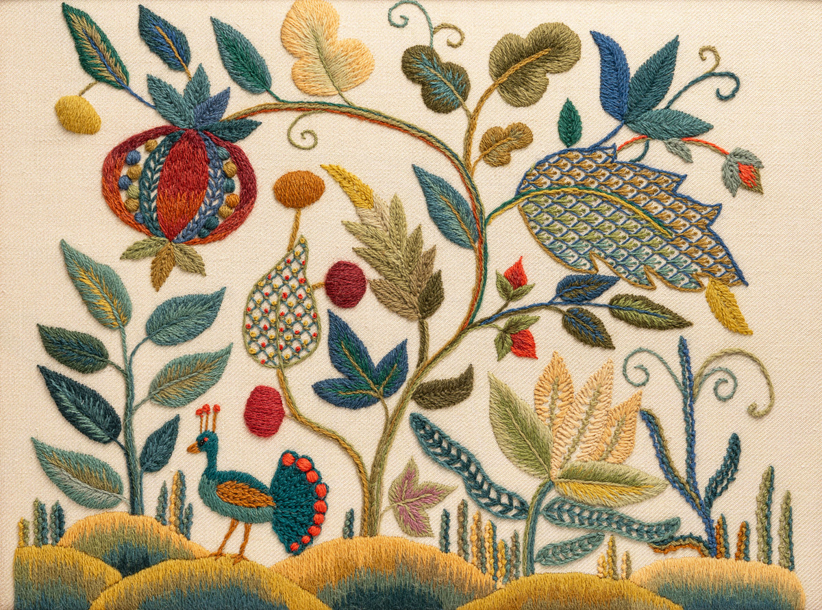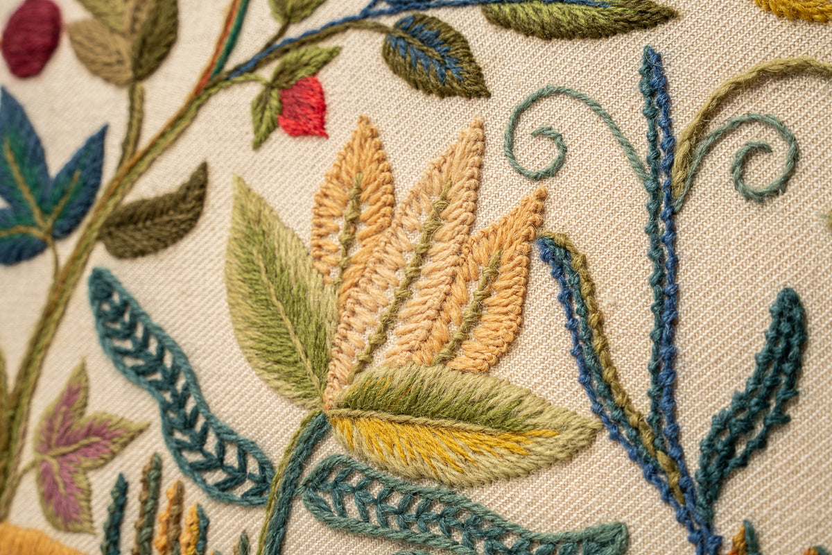 Our latest crewel work collaboration with Gawthorpe Hall and the Rachel Kay Shuttleworth Textile Collection. Enjoy this rich, Jacobean floral design featuring Pomegranates, acanthus leaves and Rachel's favourite - a vibrant blue Peacock.
