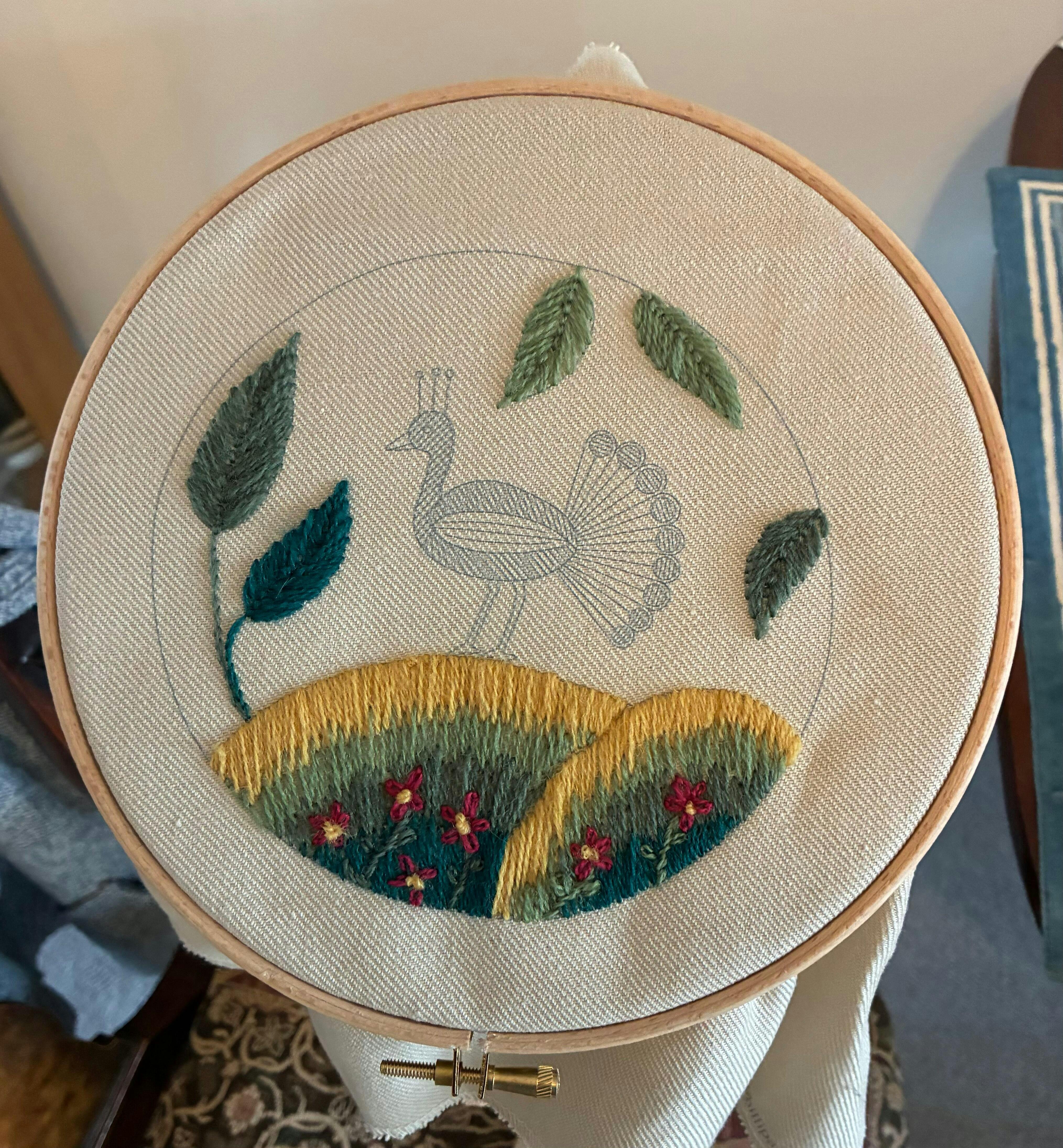 Closed Fly, Crewel Stem, French Knots, Long and Short as ‘soft shading’, Lazy Daisy, Satin, Raised Satin, and Whipped Stem Stitch.
