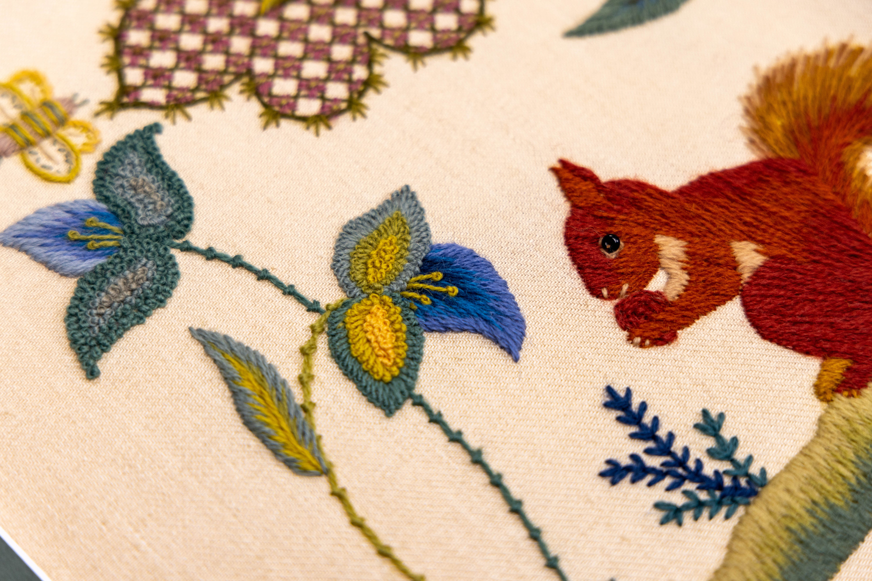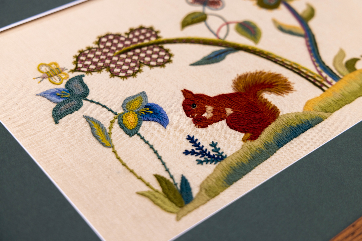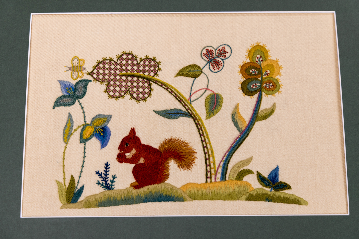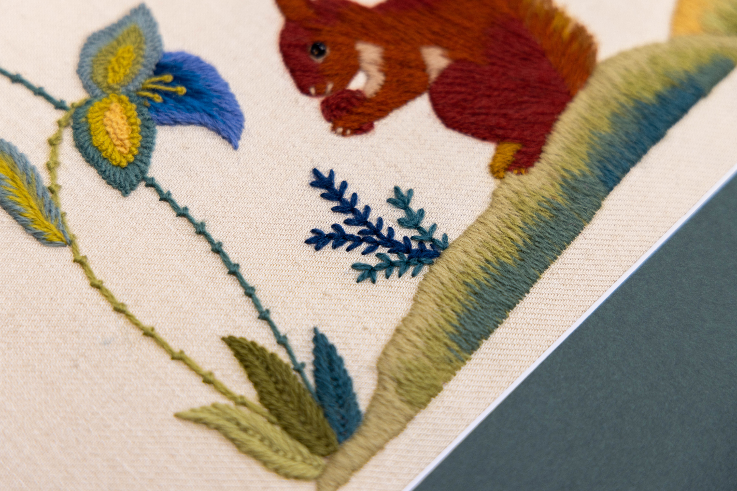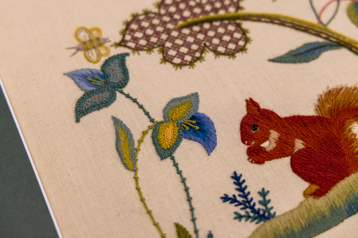 Bring the charming Greedy Squirrel to life with this complete materials kit. Inspired by early 20th-century English crewelwork, this design captures a red squirrel nibbling in its woodland home.