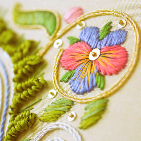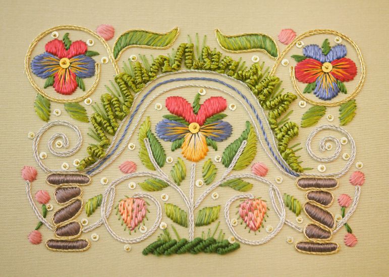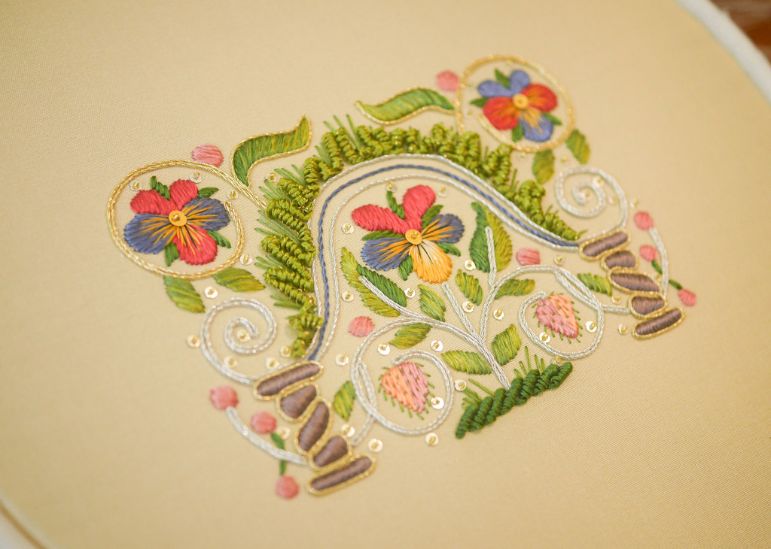 Stitches: Satin, Long and Short shading, Padded Satin, Seeding, Straight Stitches, Invisible Couching, and Bullion Knots