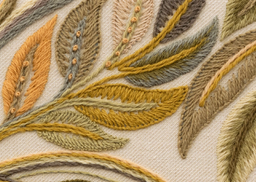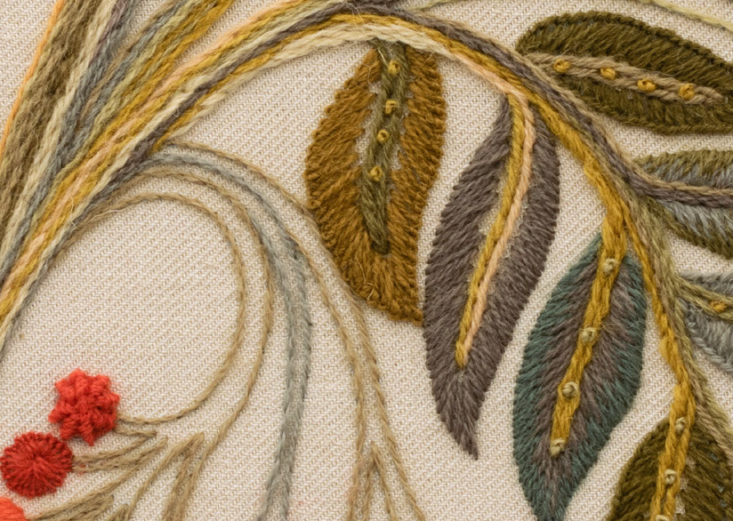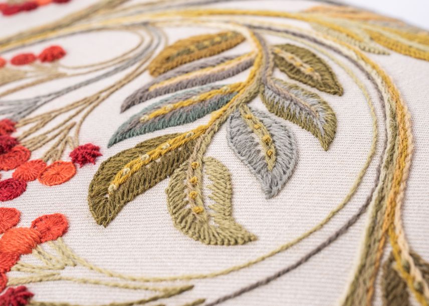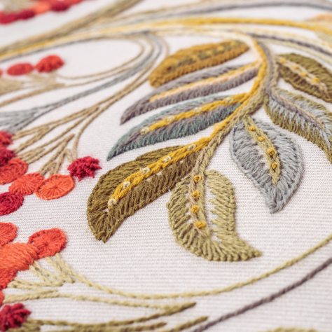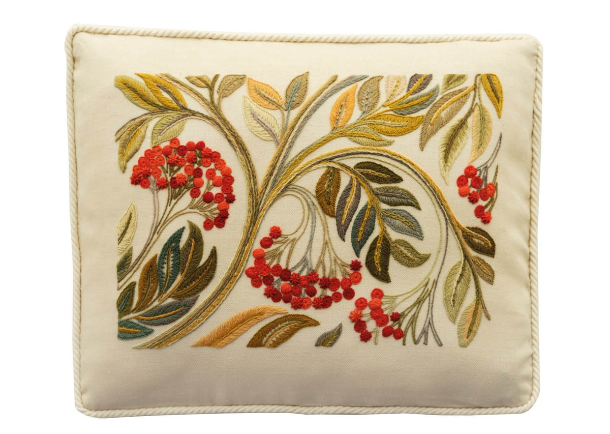 Celebrate Arts & Crafts elegance with the Rowan Tree Kit. This design features swirling foliage with vibrant red rowan berries, stitched in a wonderful and interesting combination of crewel techniques.