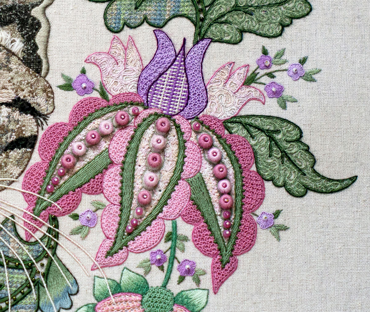 Join celebrated embroidery artist Hazel Blomkamp for an inspiring class featuring designs from her acclaimed book, Crewelwork Then & Now, co-authored by Phillipa. Perfect for intermediate stitchers, this workshop explores Hazel’s innovative approach to traditional crewelwork, blending classic techniques with contemporary flair. Guided by Hazel’s expertise, you will work on exquisite motifs from her book, learning new stitches and creative embellishments. Discover how historic crewelwork can be reimagined for today, and leave with fresh skills and a beautiful, modern piece.