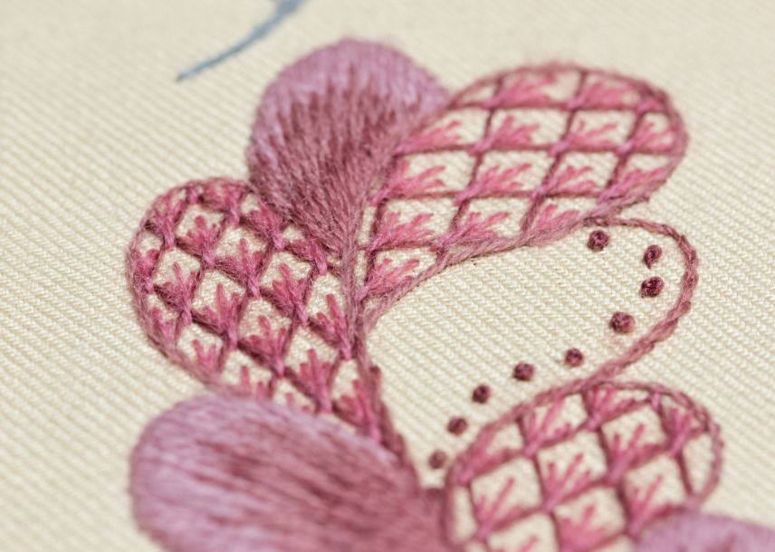 Long and Short as ‘soft shading’, Crewel Stem, French Knots, and Laid and Couched Work in three variations.